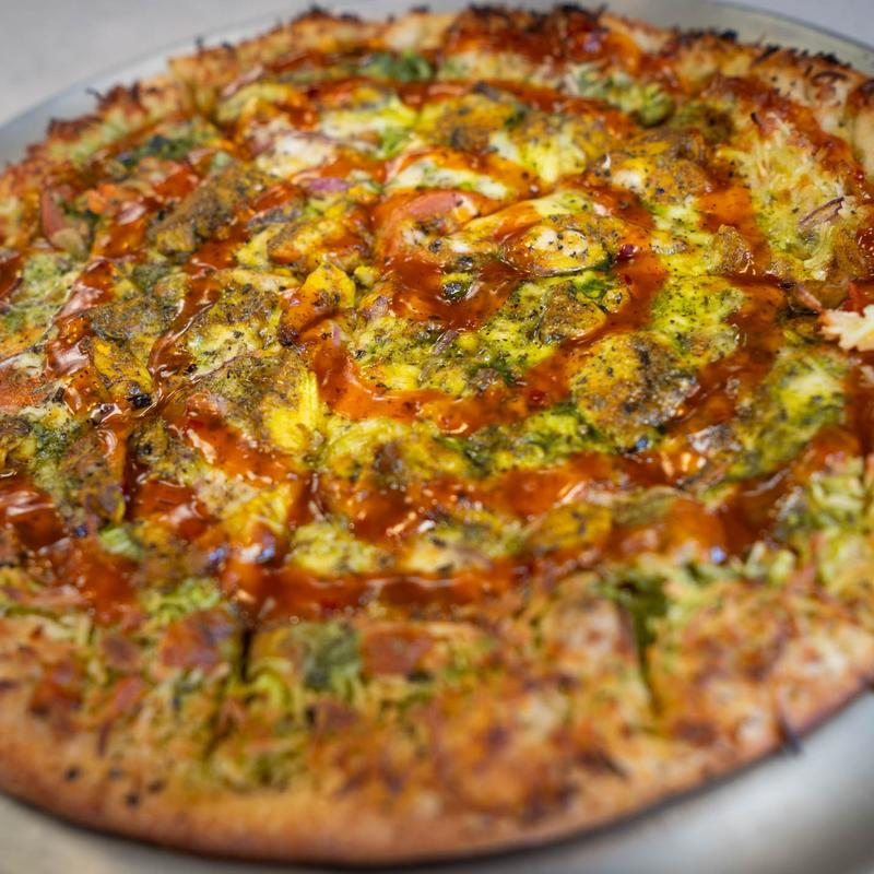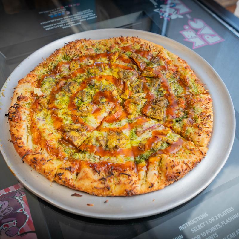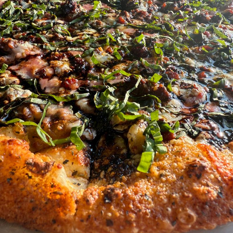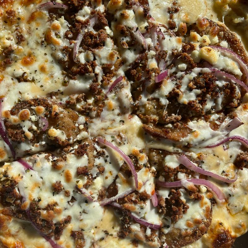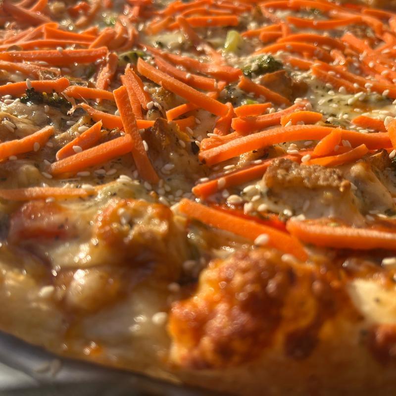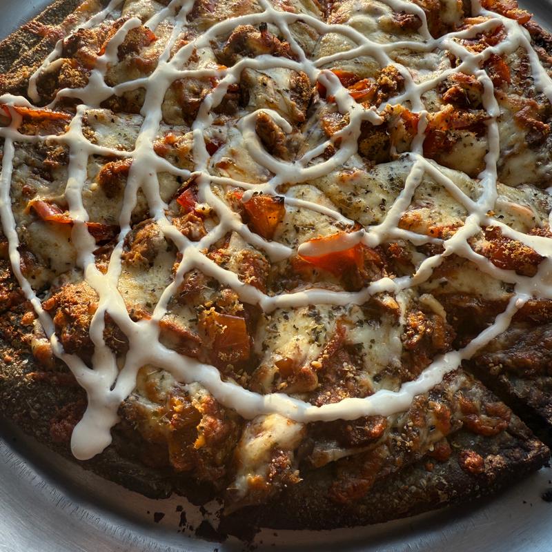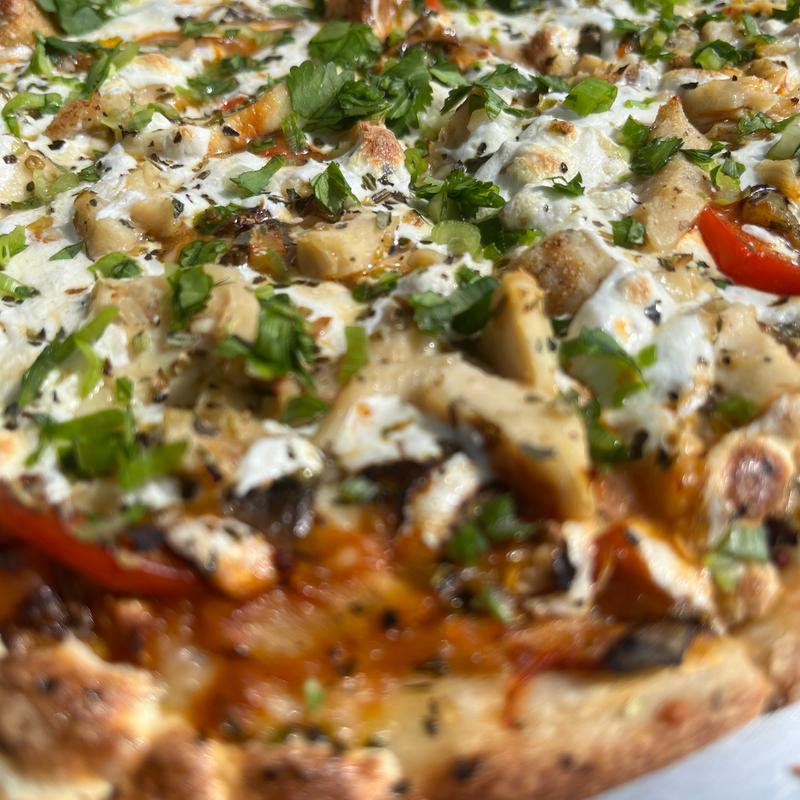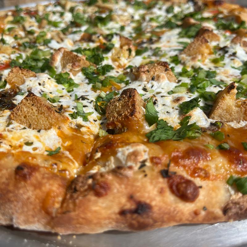 We got the buffalo wings and added chicken to the moon pie pizza. The pizza was delicious and we loved the parmesan crust. The wings stayed crispy because they put the buffalo sauce on the side...
