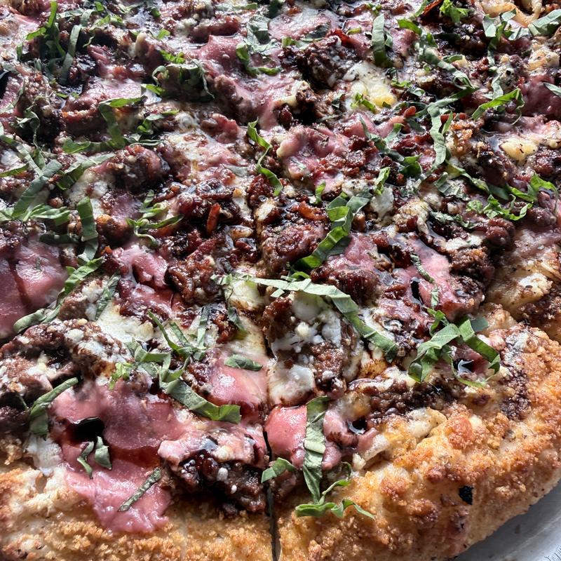 Graham Cracker Crust. Garlic Olive Oil Base. Chipotle Cocoa Rubbed Steak. Fresh Mozzarella. Feta. Raspberry Mascarpone. Cayenne Candied Bacon. Chocolate Balsamic Glaze and Fresh Basil after the oven.